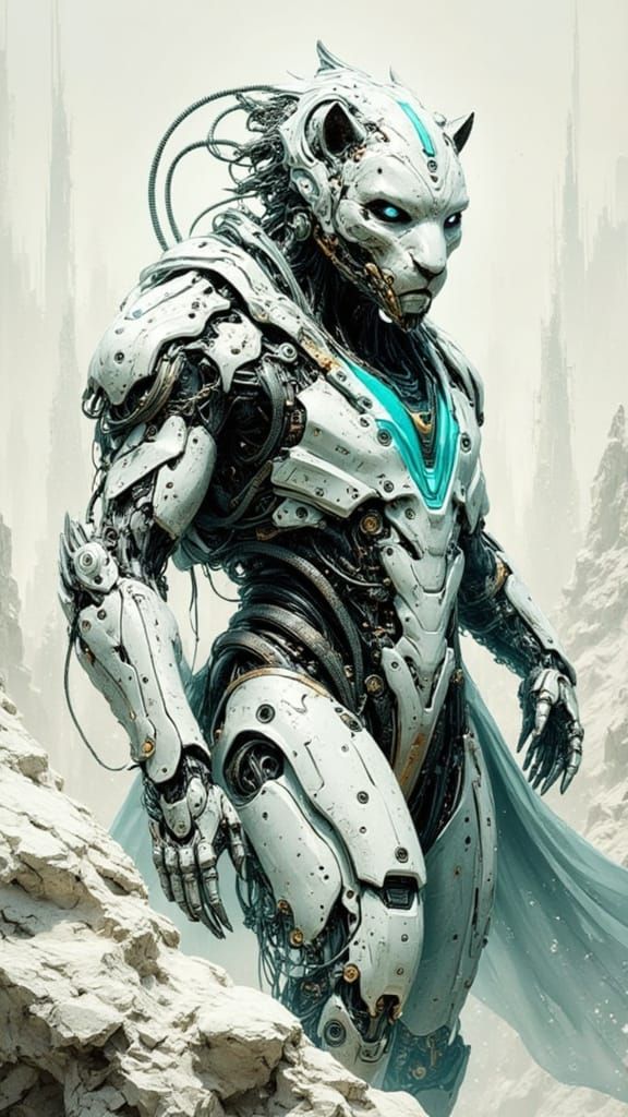 The feline-inspired armor radiates elegance and strength. Its white plating and glowing blue accents suggest heightened awareness and agility. Mechanical joints and a cape-like extension enhance the figure’s regal presence, blending predator grace with technological mastery. Set against jagged cliffs and swirling mist, the scene pulses with tension and mystique. This robotic sentinel does not merely stand. It prowls, commanding the terrain with silent authority and calculated motion.
