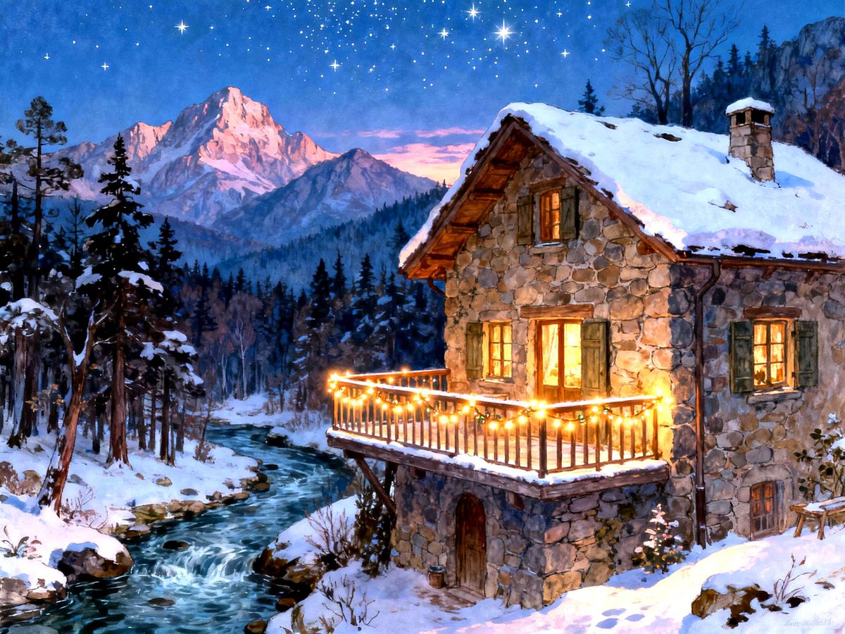 This image features a charming house nestled in a snowy forest, complete with LED decorations, a stream, and a mountain backdrop. It evokes a warm, inviting atmosphere.