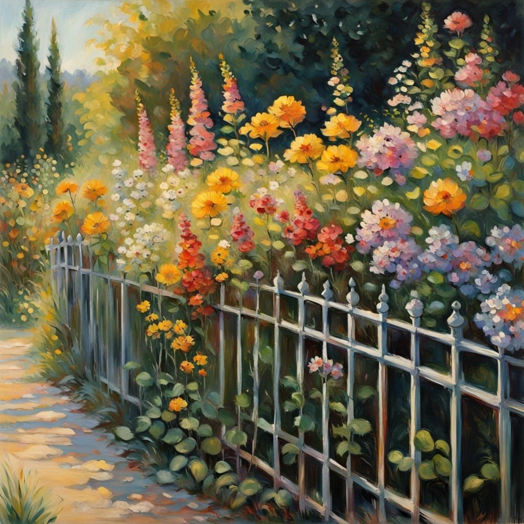 This image showcases a rustic wrought-iron fence covered in vibrant, blooming wildflowers. Rendered in an impressionistic oil painting style, it features intricate details and warm, harmonious colors during golden hour.