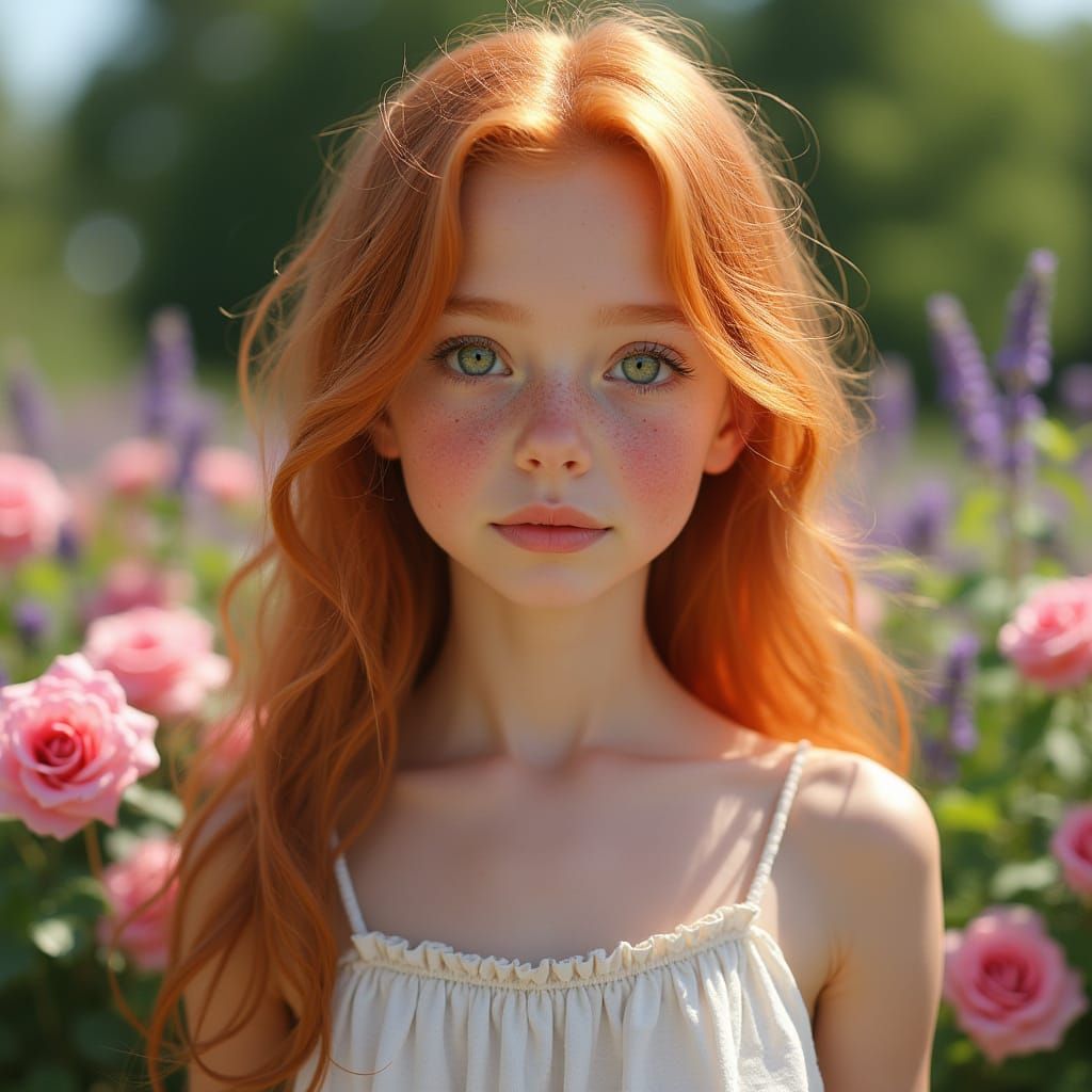 This image shows a beautiful redhead girl with fair skin and green eyes in a sunlit garden. The photorealistic style captures fine details with a shallow depth of field.
