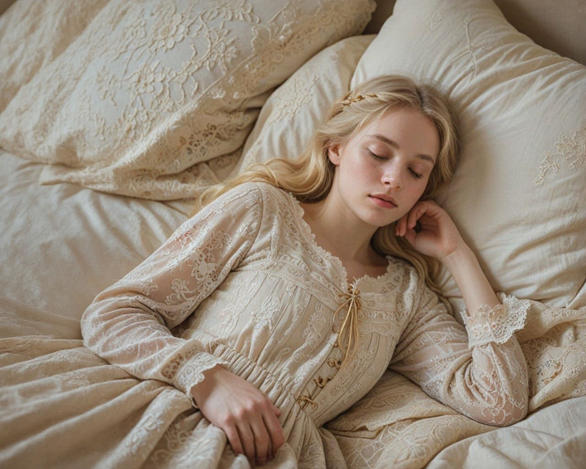 This dreamy image shows a young blonde girl in a medieval nightgown sleeping peacefully. Gentle morning light illuminates the scene in soft, pastel colors with a delicate, soft focus.