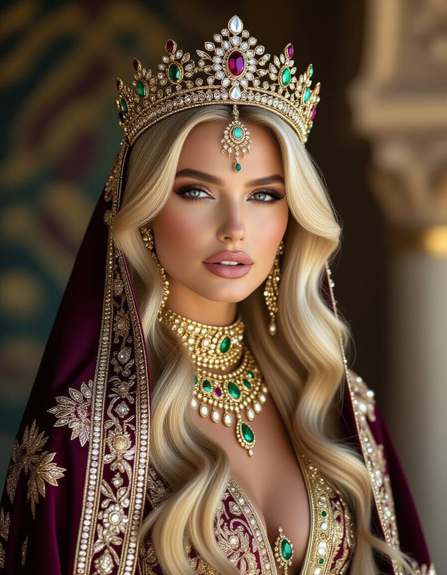 A striking picture of a regal blonde woman wearing a luxurious abaya and ornate crown. The image is reminiscent of high fashion photography, with rich, jewel-toned colors and cinematic lighting.