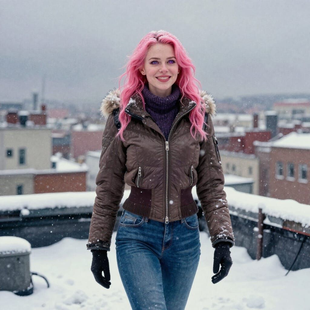 This image shows a pink-haired woman smiling in a winter jacket during a snowstorm, rendered in a watercolor art style with cinematic lighting and film grain effects.