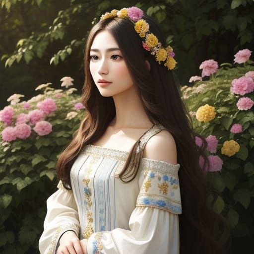 This image shows a medium shot of a young woman in a garden, head and shoulders. The portrait features oil painting style, with golden threads in her embroidered dress and soft light.