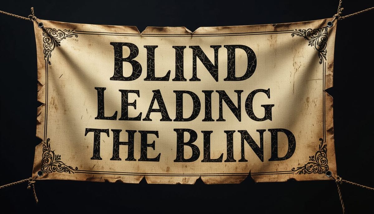 This hyperrealistic image features a banner with "Blind leading the blind" in weathered, intricate lettering. It has high contrast, moody lighting, and deep shadows for a cinematic feel.