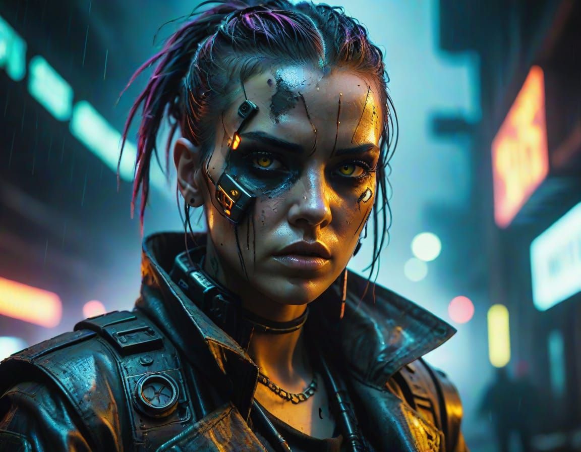 This image captures a close-up portrait of a model showcasing edgy, dystopian fashion made from recycled materials and neon-lit circuits, set against a grimy, rain-slicked runway in post-apocalyptic city ruins. Harsh, cinematic lighting and gritty textures evoke a high-tech atmosphere with urban decay.