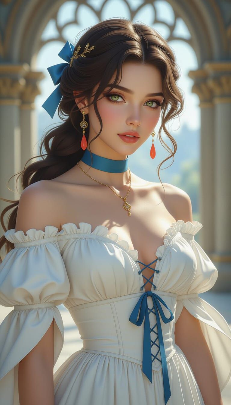 A striking picture of a green-eyed woman in a white dress with ribbons and medieval jewelry. The artwork captures a highly detailed concept art style with vibrant colors and intricate textures.