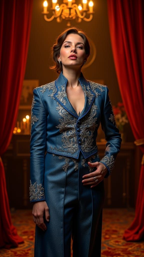 This image shows a confident cabaret singer on a 19th-century stage. The singer wears a dazzling blue jacket embroidered with silver thread and is illuminated by a warm, golden glow in an art nouveau style.