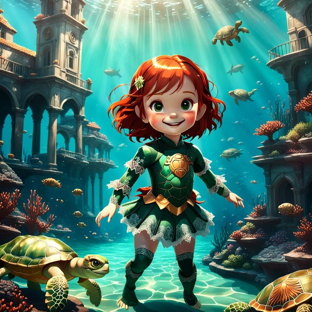 This image shows a toddler with red hair in a green lace costume, smiling in the underwater city of Atlantis. The digital 3D anime art features vibrant colors, soft sunlight, and shimmering scales.