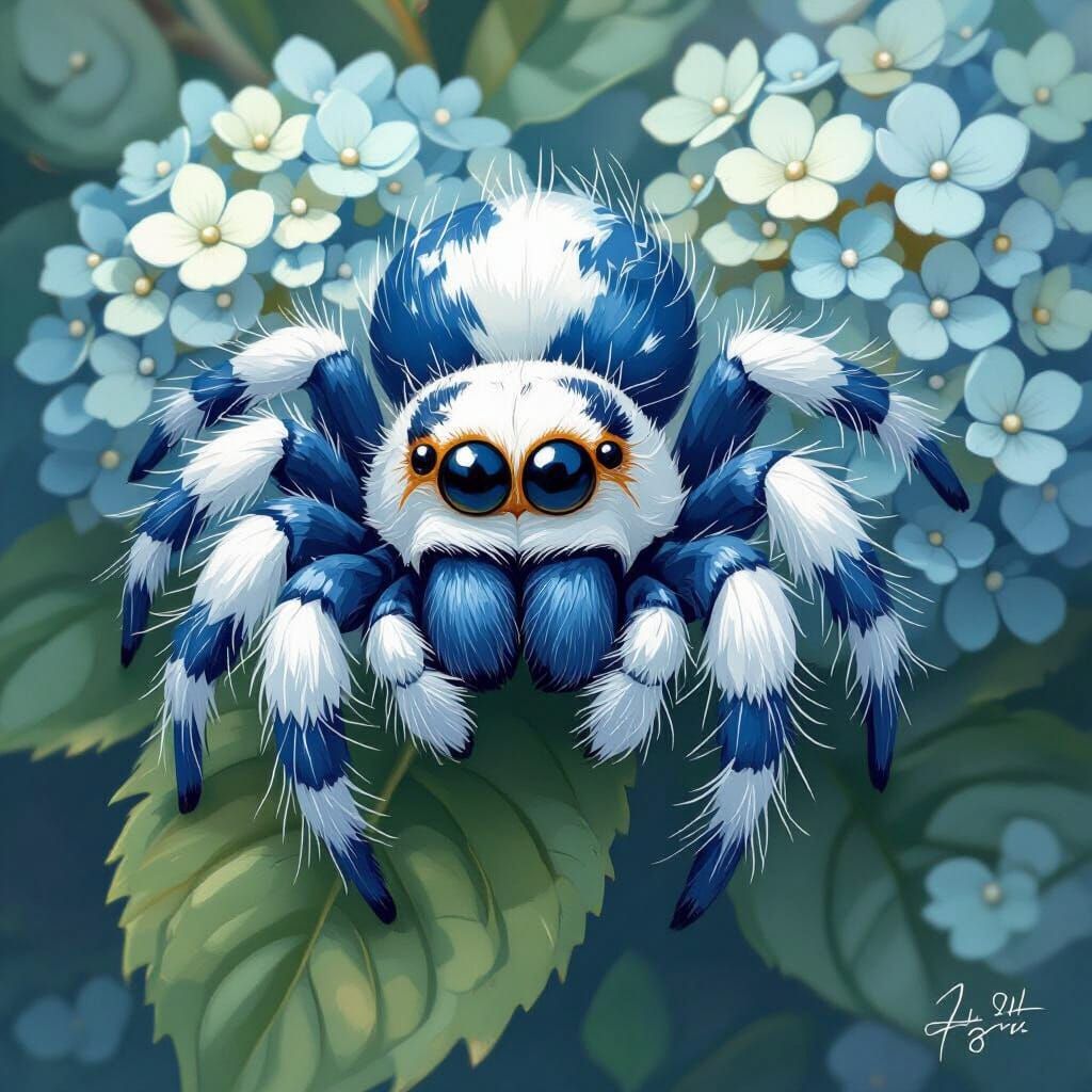 A whimsical image of a cute spider with a blueberry-tomato abdomen and hydrangea-like fur. The image is rendered with intricate details and soft pastel colors in a fantastical style.