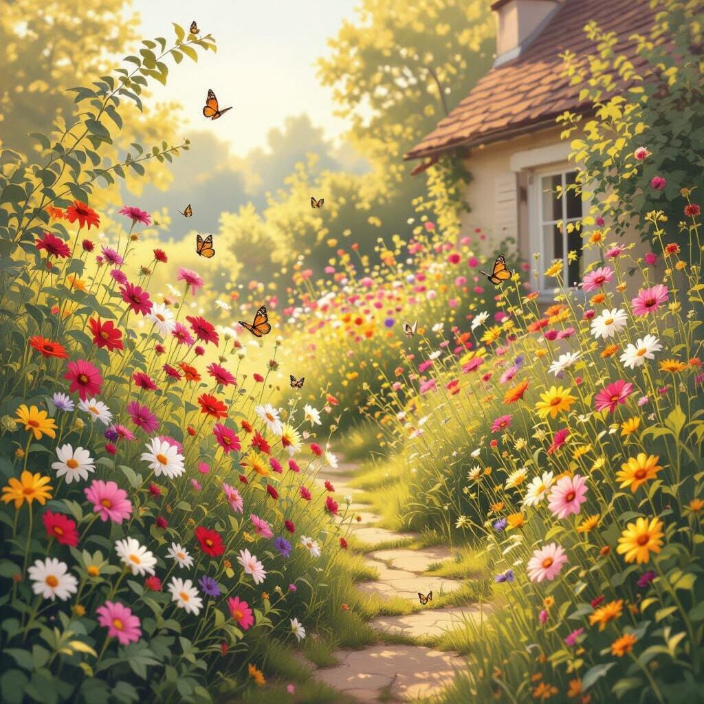This image shows a vibrant, overgrown cottage garden bathed in warm, golden hour light. Detailed oil painting captures wildflowers and fluttering butterflies, evoking a nostalgic summer memory.