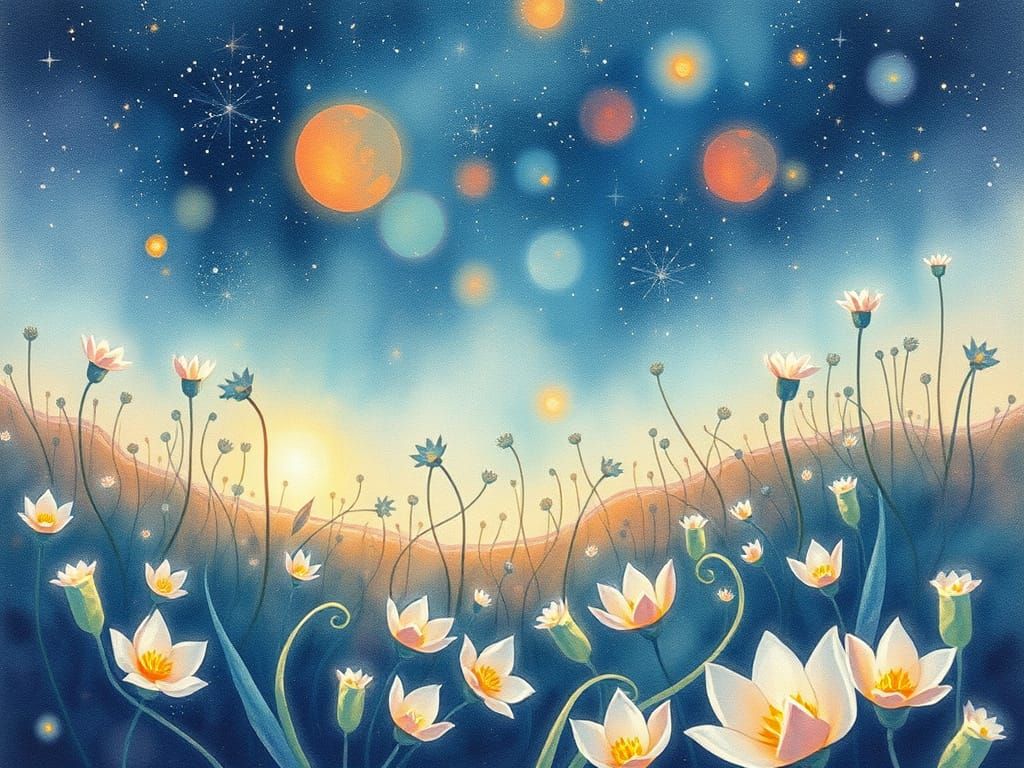 This image depicts a celestial garden with crystal plants glowing from cosmic light. Rendered in soft watercolor with pastel frost and citrus hues, it evokes a serene, ethereal beauty.