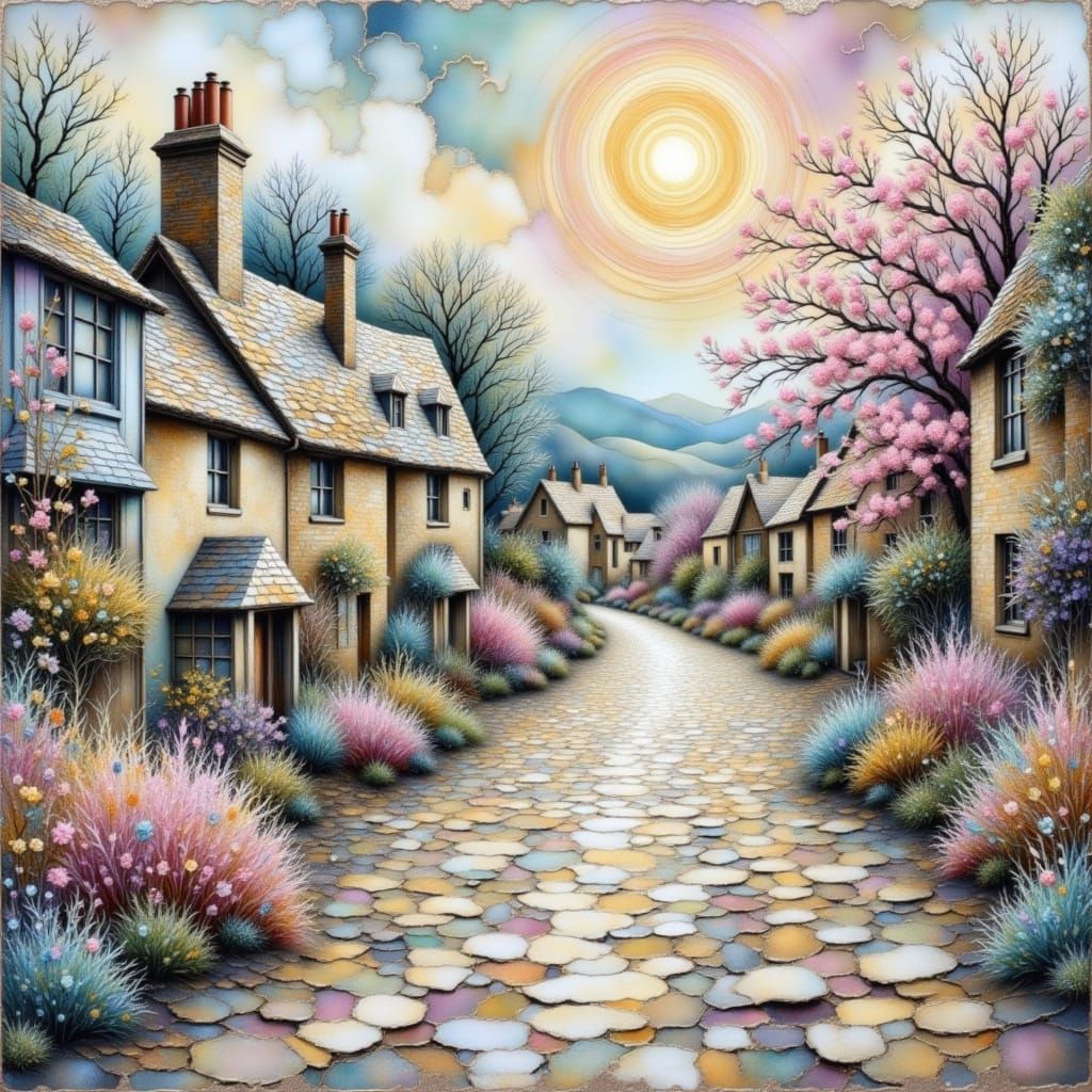 This image showcases an old English village with stone cottages and a high street, rendered in a mixed media collage style with 3D textured layers and chalk smudging.