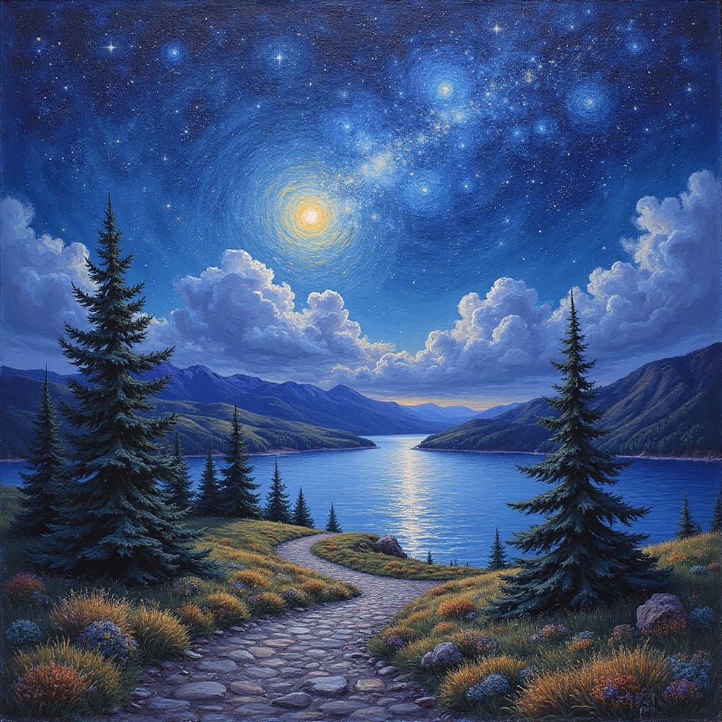 This image shows a breathtaking night landscape with vibrant stars, deep blues, and rich golds, reminiscent of a heroic oil painting. Thick brushstrokes evoke the style of Van Gogh and Monet, with a touch of Sorolla's expressiveness.