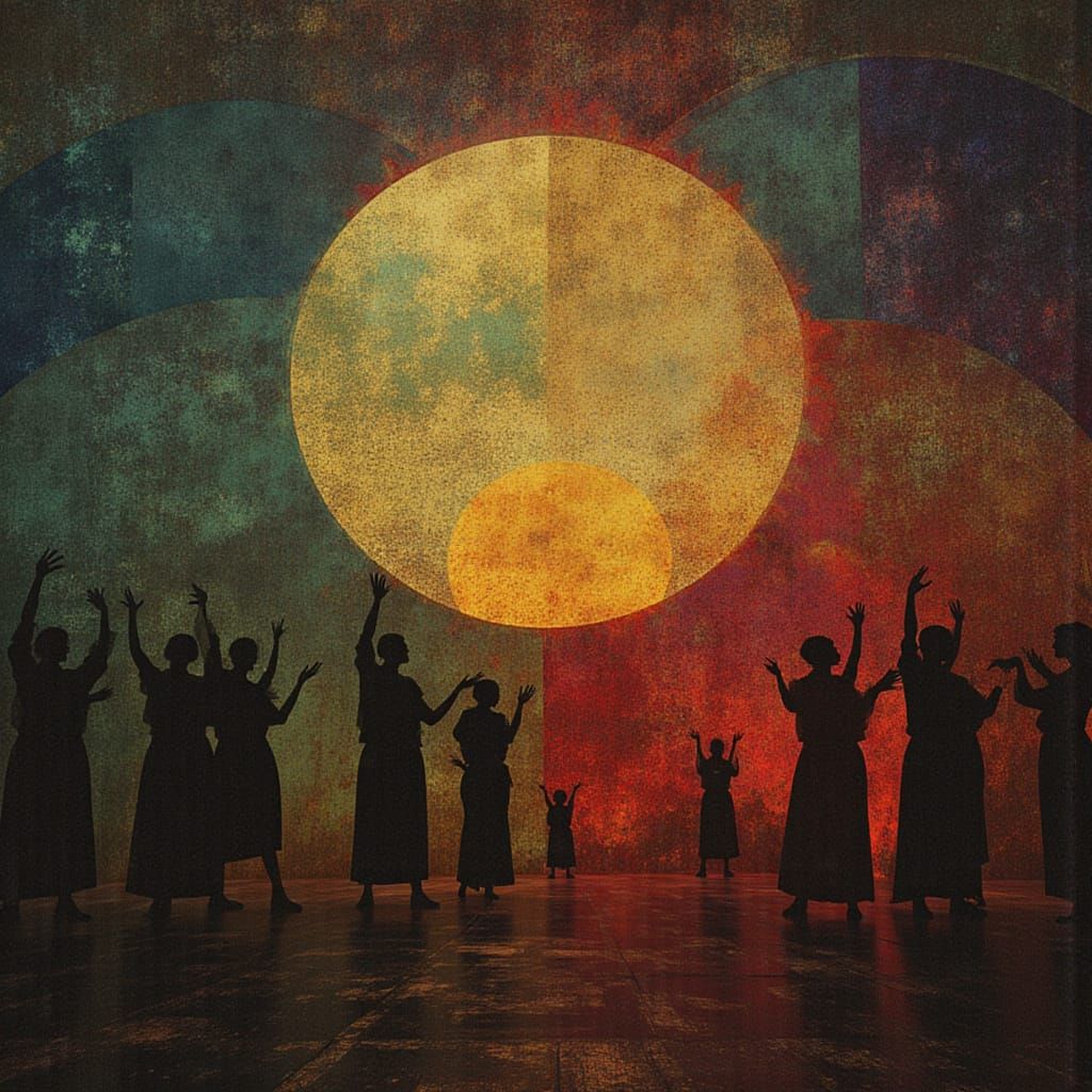 This image depicts a group of people looking up at the night sky, seemingly in awe of the stars. The scene evokes a sense of wonder and cosmic connection.