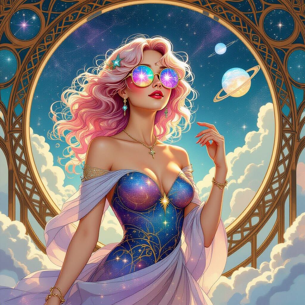 A celestial astronomer with rose quartz skin and galaxy hair observes the cosmos. The figure is surrounded by floating telescopes in an art nouveau style.