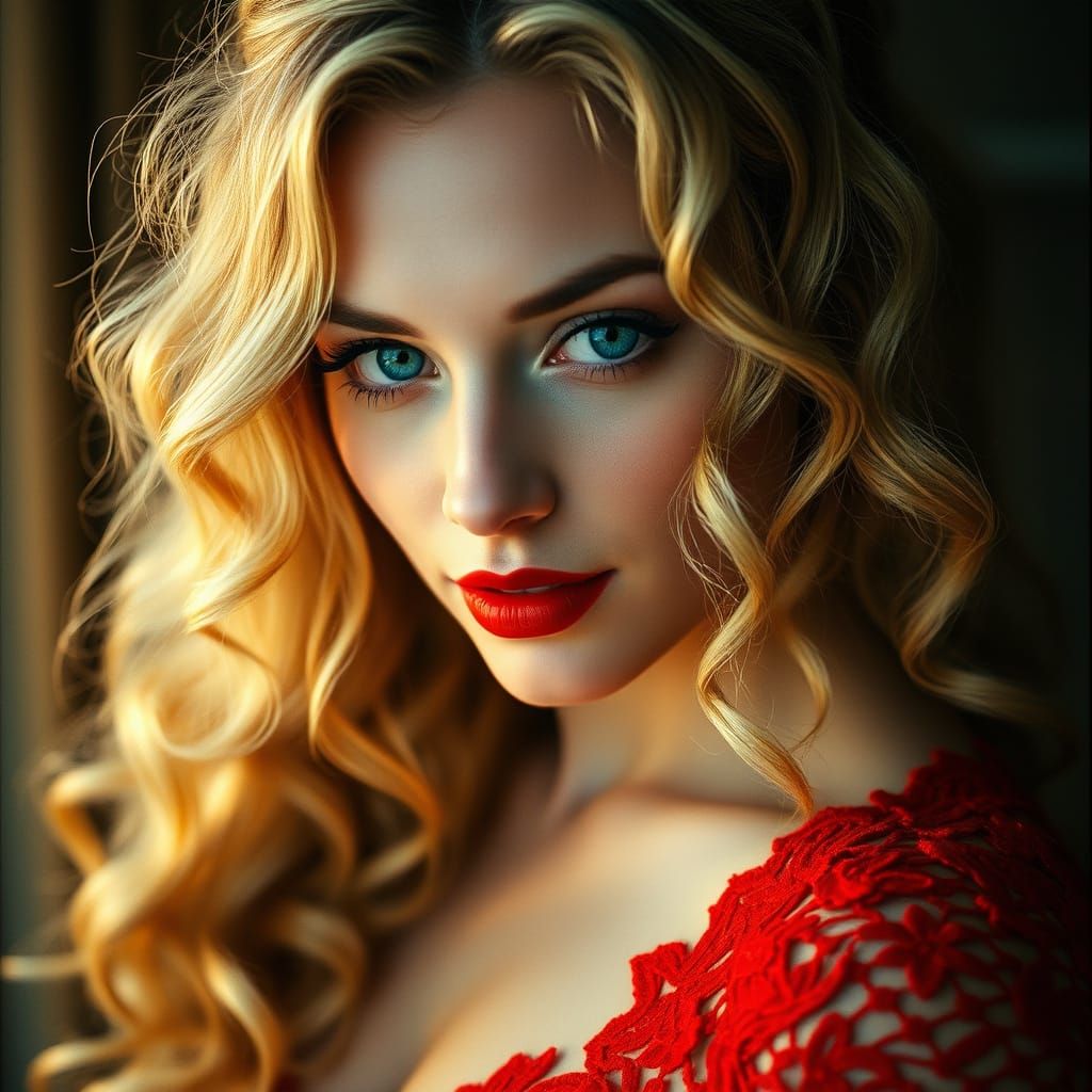 A cinematic portrait of a woman with long blonde curly hair, sun-kissed skin, and electric blue eyes, set against a rich, film-grain backdrop, evoking a bygone era of elegance and mystery.