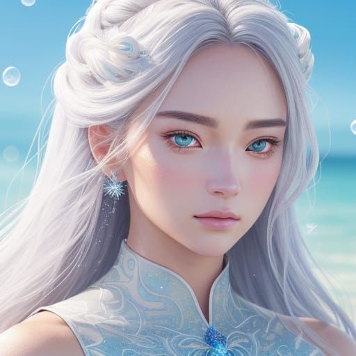 A stunning anime portrait of a girl wearing a frost-colored swimsuit with delicate patterns and sparkling water droplets. Her vibrant eyes and luscious hair are set against a soft, golden background.