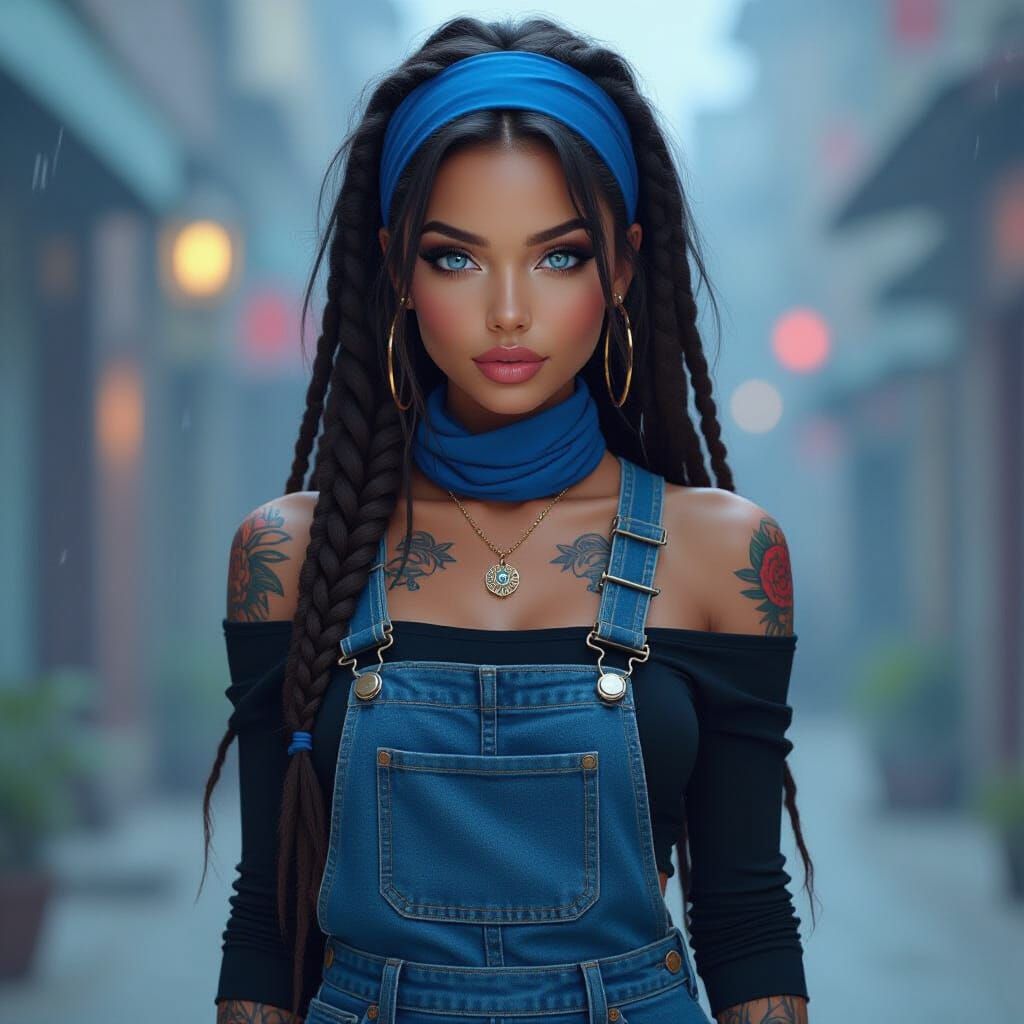 A striking picture of a futuristic woman with blue dreadlocks and tattoos. She wears denim overalls and a black top in this holographic acrylic art style.