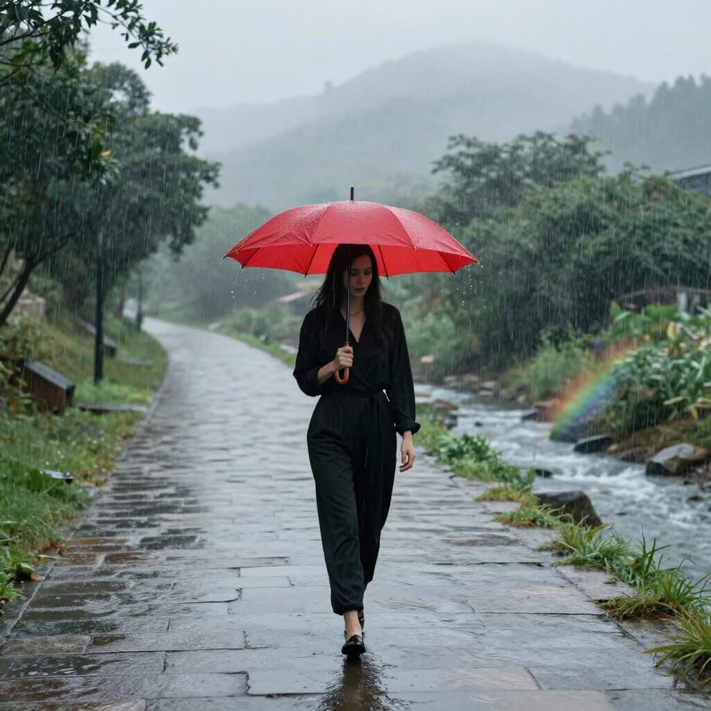 This image depicts a solitary woman in black holding a red umbrella, walking on a wet path with a subtle rainbow in a misty, natural setting. Cinematic and atmospheric.