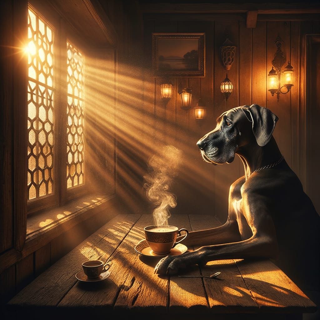 This serene image captures the warmth of a peaceful morning, with the first sunbeams dancing through a lattice window and illuminating a German Great Dane sitting at a wooden table, surrounded by the gentle aroma of freshly brewed coffee.