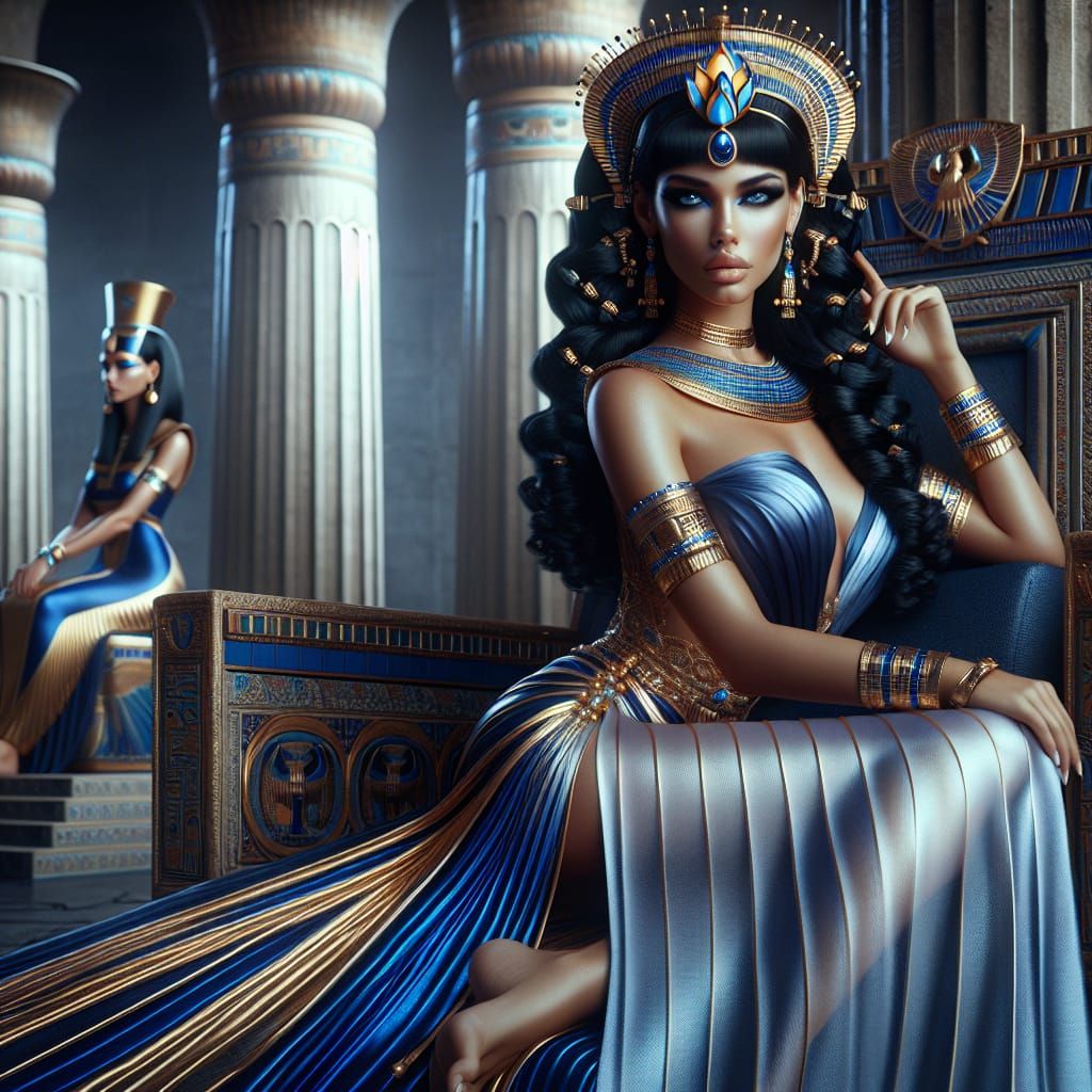 A stunning digital painting of an Egyptian woman in a royal blue and gold kalasiris gown, adorned with intricate details and a golden lotus headpiece, sitting on an ancient Egyptian throne in a temple setting, exuding powerful attributes of healing, fertility, and protection.