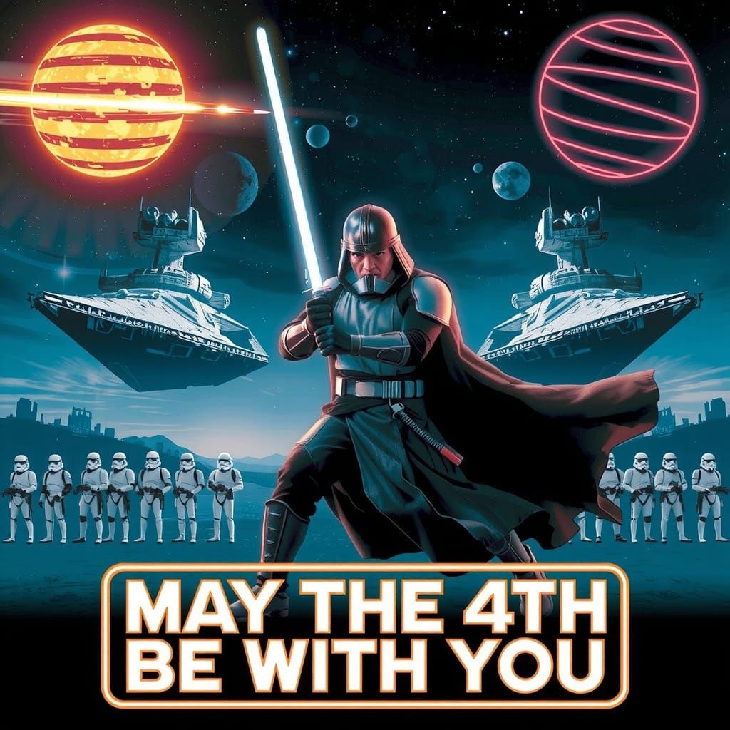 This image captures a powerful Jedi knight in a dramatic battle stance, surrounded by stars, galaxies, and stormtroopers, with a retro neon