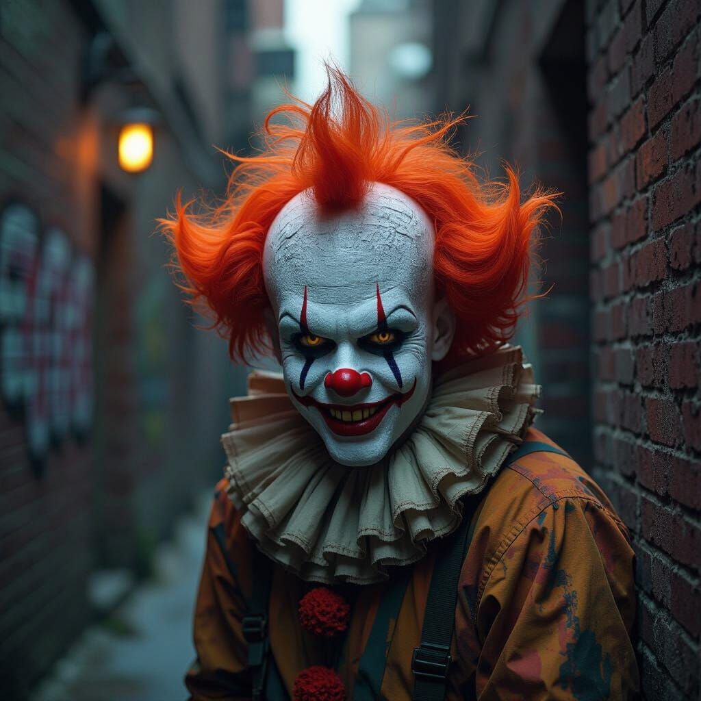 A menacing clown monster lurks in a shadowy alley. This image captures the creature's tattered wig and faded smile with a blend of biomechanical and futuristic aesthetics.