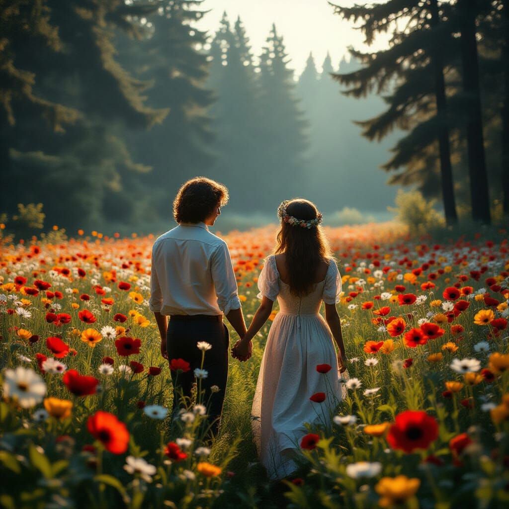 This image shows a young couple in a flower field within a vintage, fantastical forest. The scene evokes a dark fantasy aesthetic reminiscent of 1970s cinematic style.