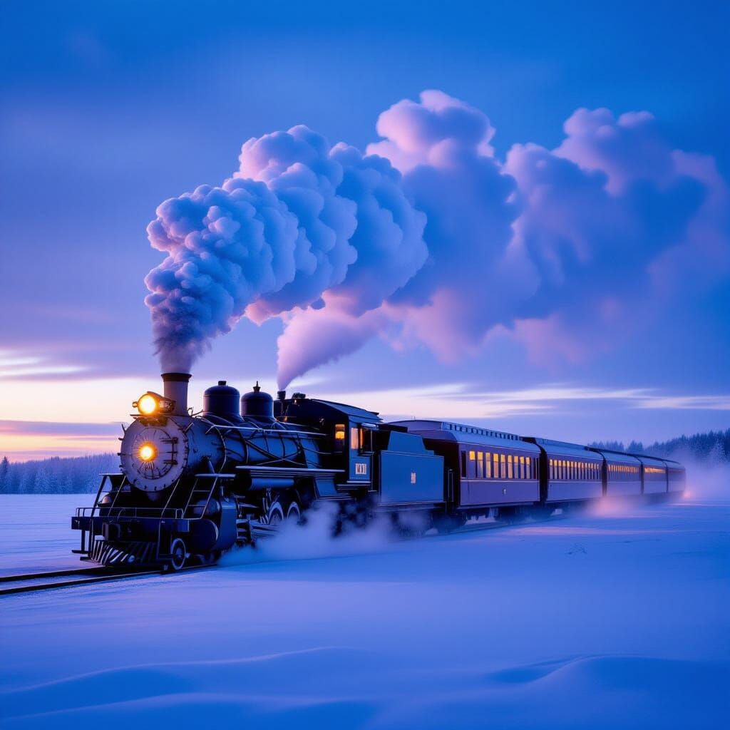 This image captures a vintage steam train traversing a snow-covered plain at twilight. Frost covers the train, which emits steam, while warm light emanates from its windows, contrasting with the cool winter hues. Evokes classic winter travel photography.