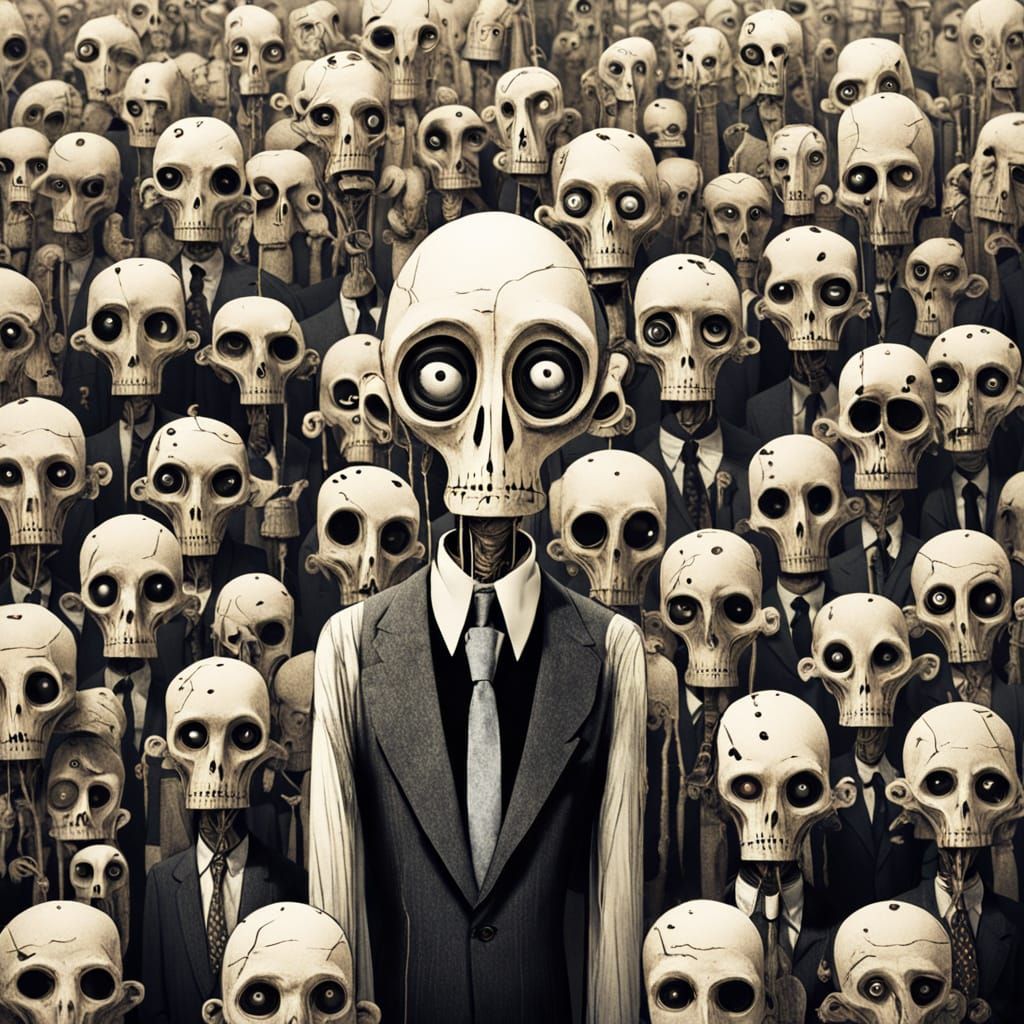 This image presents a surreal humanoid with a large head, elongated snout, and sad eyes, adorned in neckties. The background is a disturbing collection of doll parts, junked birdcages, and mannequin limbs.