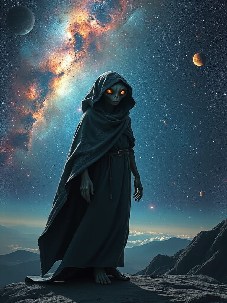 This image shows a mysterious alien at the edge of a surreal galaxy, surrounded by swirling patterns, starry expanse, and celestial bodies, in a dreamlike, sci-fi atmosphere.