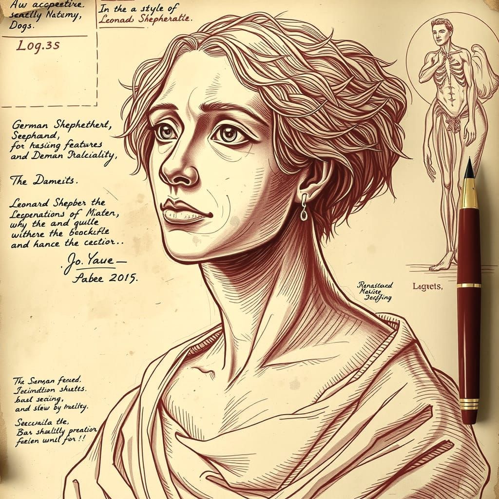 Photorealistic blue chalk drawing on antique parchment, depicting a German Sheppard dog in the style of Leonardo da Vinci, with intricate facial features and delicate shading. Detailed marginal notes and sketches surround the figure, illustrating anatomical studies. The paper is softly drawn with a beautiful ...