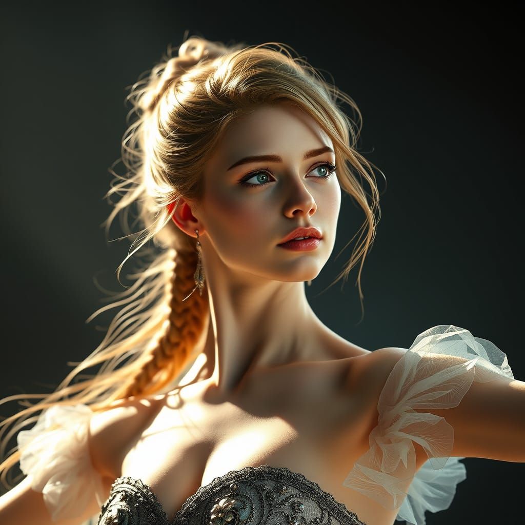 This image showcases a detailed, hyperrealistic portrait of a ballerina with golden hair, illuminated by dynamic light and vibrant, triangular colors, reminiscent of Unreal Engine 5's cutting-edge visuals.