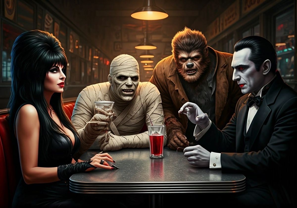 This image captures a surreal moment where Elvira, surrounded by iconic monsters, shares a laugh-filled evening in a nostalgic American diner. The artwork blends classic horror characters with a fun, retro atmosphere.
