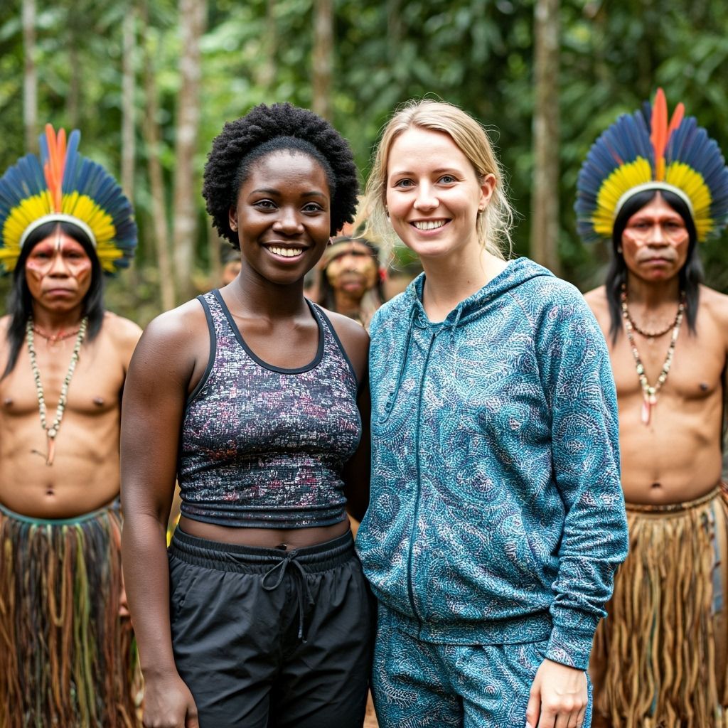 This image shows two smiling women in leisurewear standing with indigenous tribe members protesting deforestation in the Amazon rainforest. The photorealistic image features a bokeh effect and natural lighting, reminiscent of Annie Leibovitz's style.