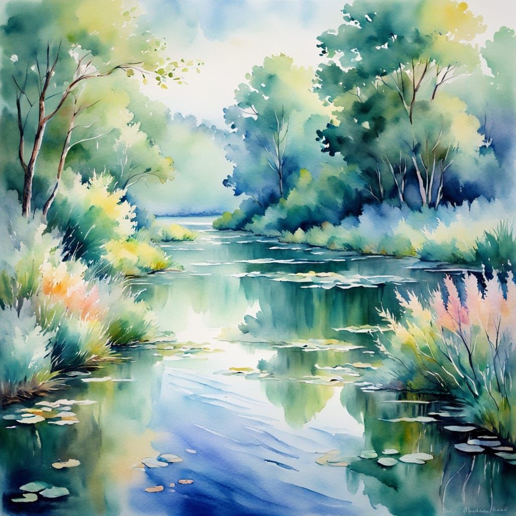 A dreamy watercolor landscape in a Monet-inspired impressionistic style. Soft brushstrokes, vibrant colors, gentle light, and feathery textures create a serene and ethereal atmosphere.