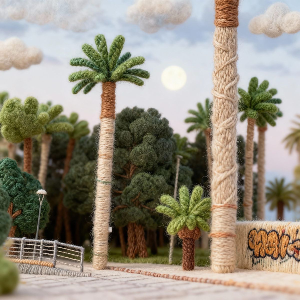 This image showcases a charming diorama meticulously crafted from yarn and felt, evoking a cozy, fairytale atmosphere with soft, diffused fibers and stitches, presented in a slightly reduced scale.