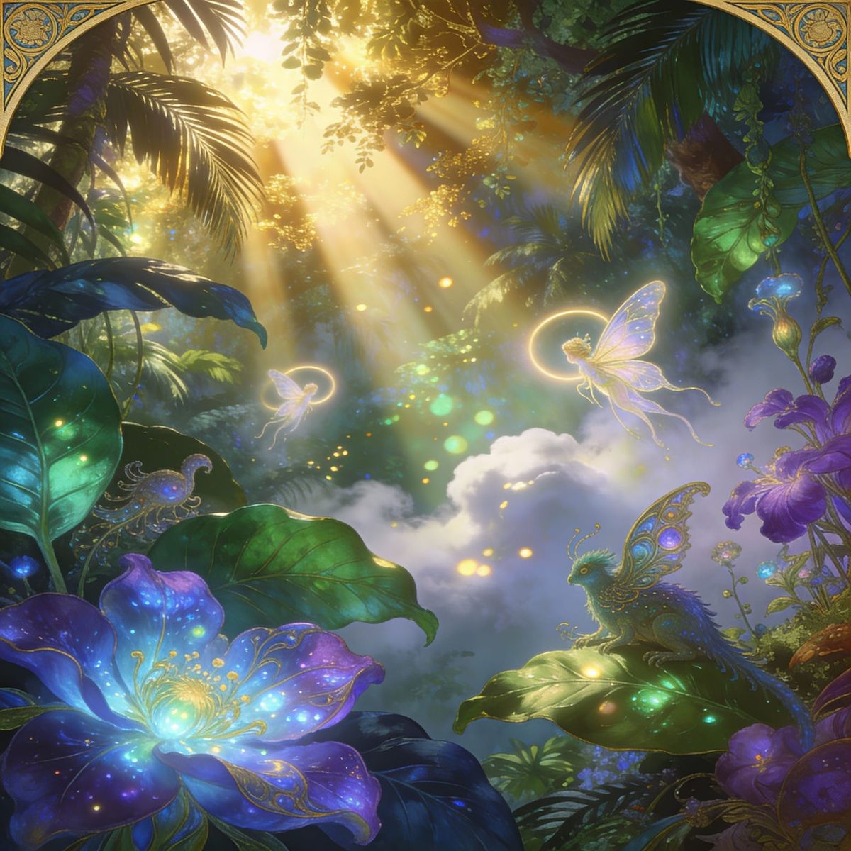 This image depicts a magical fairy realm in a tropical forest, filled with mystical creatures and glowing plants. It showcases divine light and saturated colors in a luminous art style.