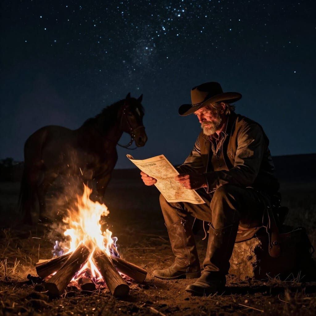 A grizzled cowboy, his face etched with the stories of the frontier, sits by a campfire under a sky ablaze with a million stars. His trusty ...