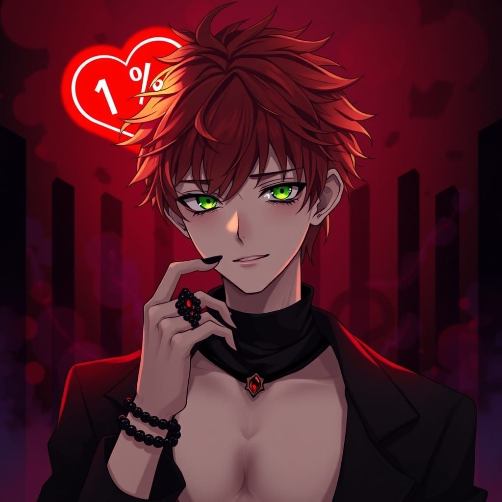 This image shows a sad young man with red hair and green eyes, set against a dark background with red and purple mist. The portrait is rendered in an anime style.