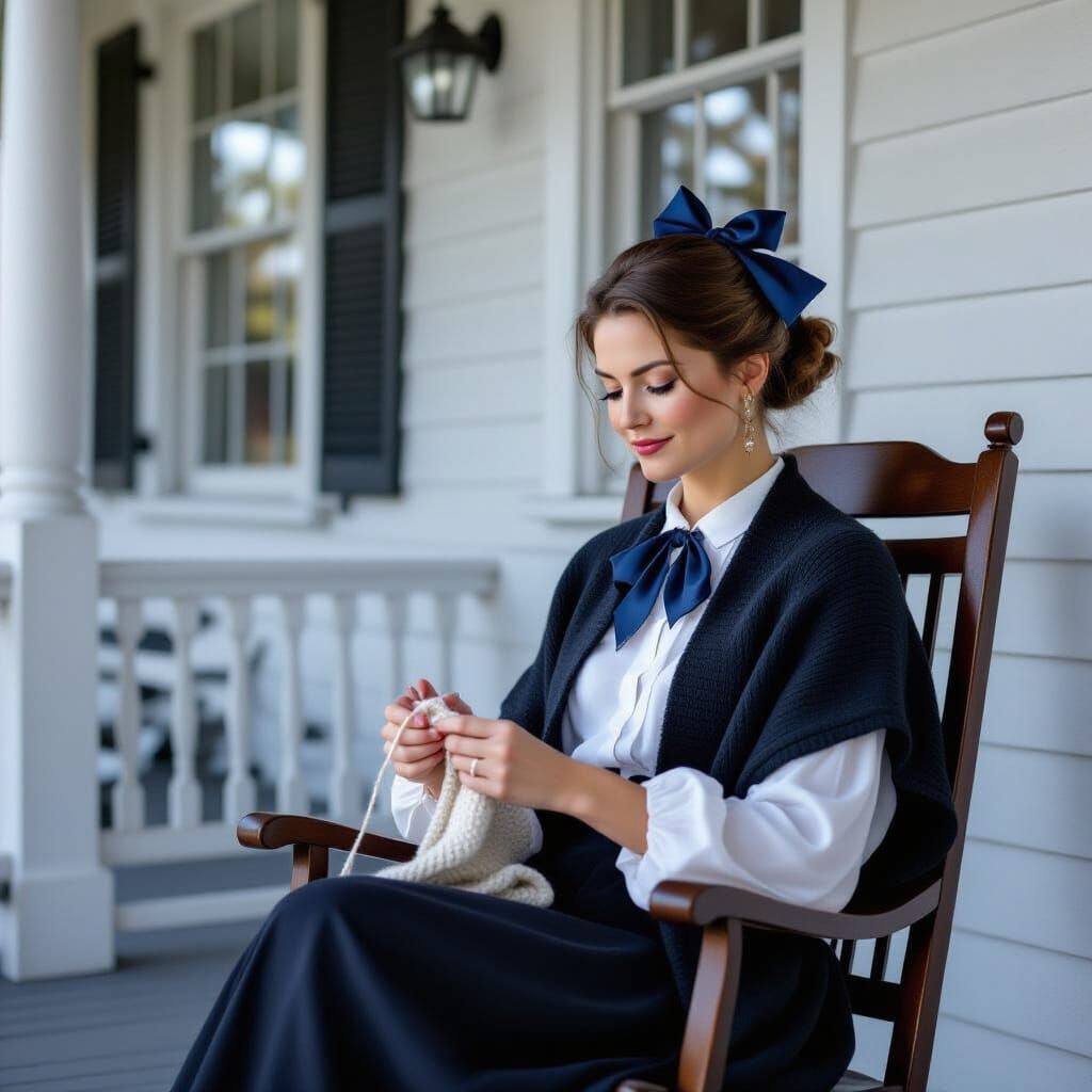This image shows a woman in her late thirties knitting on the front porch of a large, white early Victorian house. She wears a dark skirt, white blouse, and shawl, with her hair tied back.