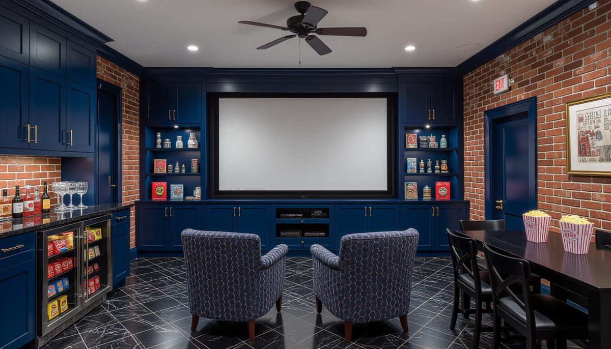 This image showcases a charming Victorian-style movie room featuring a central screen, dark blue cabinets, and brick wallpaper. It includes theater seating, a long table, and a black marble floor, creating a cozy cinematic atmosphere.