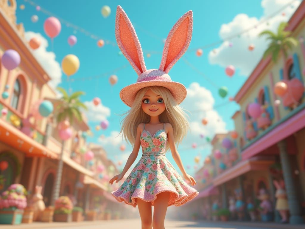A colorful woman with a floral dress and Easter bunny ears walks down a lively street in a festive Paas parade, set against a bright blue sky with puffy white clouds, in a style reminiscent of classic Disney and Pixar animation, with bold textures and hyper-realistic digital art.
