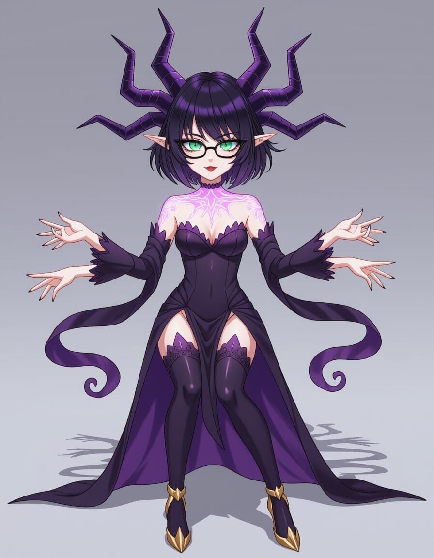 This image shows a cel-shaded anime illustration of Katerina Heiss, corrupted but radiant. Her porcelain skin features magenta filigree, and she sports violet horns and ribbon arms in a seductive nun-couture armor.
