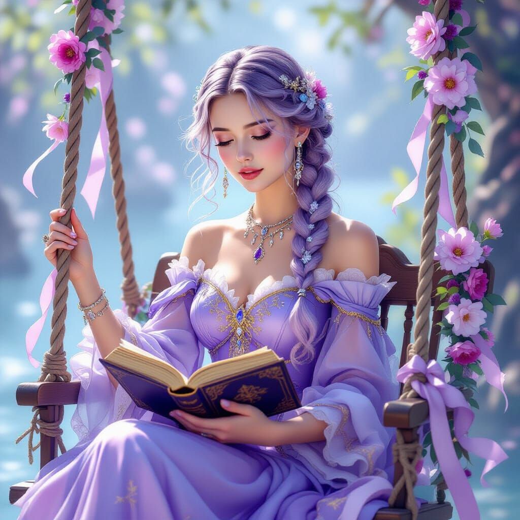 This image shows a beautiful woman with lavender hair sitting on a flower-covered swing. She wears a jeweled gown and holds a glowing book. The art style is reminiscent of digital watercolor painting.