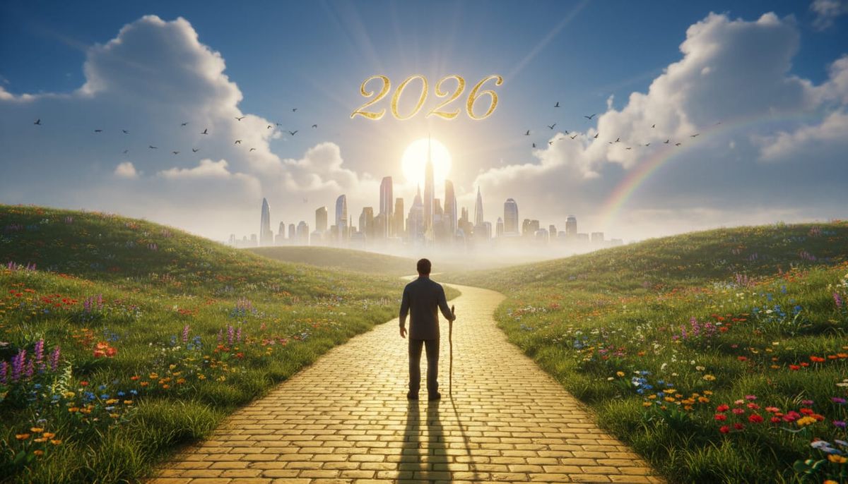 This image shows a man beginning a journey on a yellow brick road towards a glowing futuristic city. Features include rolling hills, wildflowers, a radiant sun, and the year 2026. Cinematic and hopeful atmosphere.