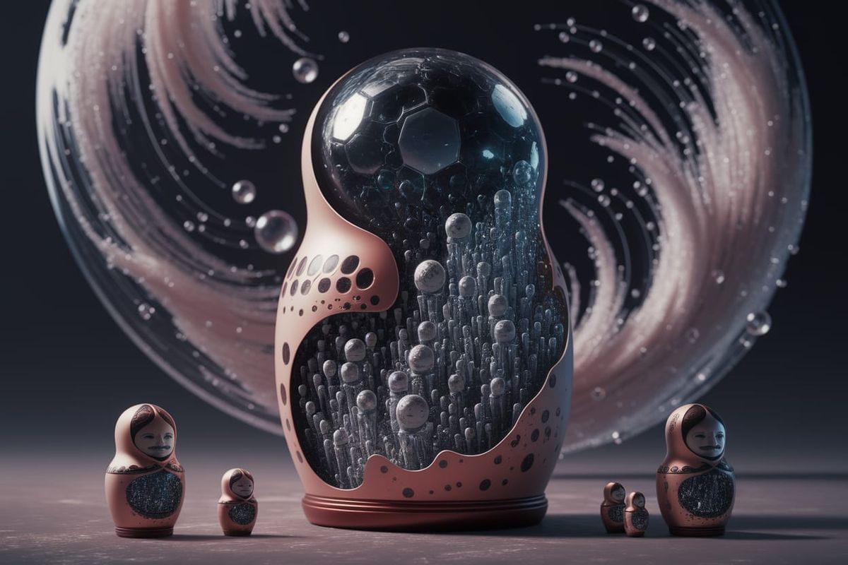cutaway view giant cyber matryoshkas revealing inner workings of neuromorphing inter-harmonics dimetric view detail so fine it appears infinite reflections symbolising introspection and dreams about another entity backed by exoembodiment swirling nebulous fog that refracts and absorbs the surrounding ...