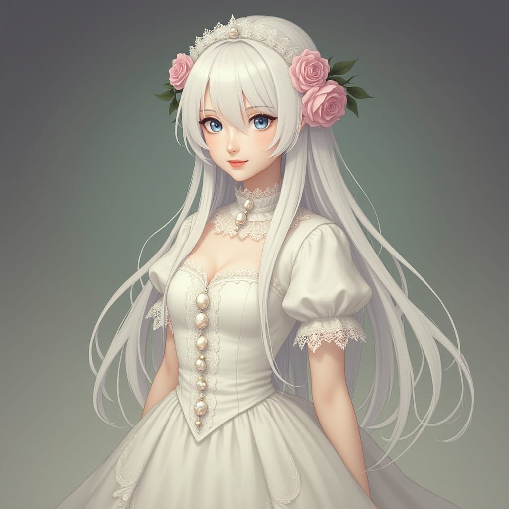 A beautiful young albino woman in an ornate Victorian gown with mother-of-pearl. Rendered in a romantic style with soft, ethereal light.