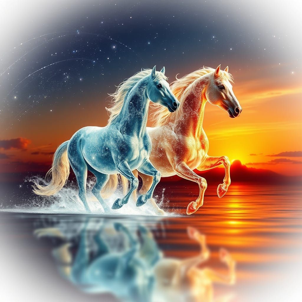 This stunning image captures two horses rising from the ocean, surrounded by a misty aura and vibrant sunset hues. The scene is set against a starry galactic night sky, with the horses' forms shimmering and glowing in the light. The artwork is characterized by its use of HDR, photorealistic techniques, a...